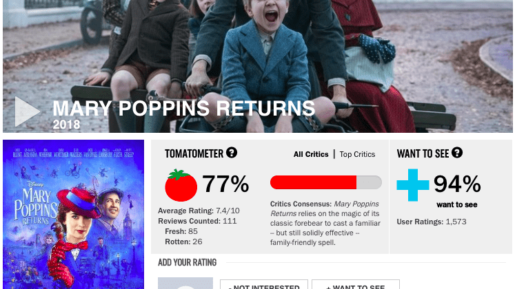 Hiện tại, Mary Poppins Trở Lại đã được công chiếu cho giới phê bình và nhận được số điểm 77% từ 111 đánh gía của giới phê bình trên trang tổng hợp Rotten Tomatoes. Hãy cùng Moveek điểm qua những lời khen ngợi lẫn chê bai mà giới phê bình dành cho bộ phim âm nhạc, gia đình này nhé: